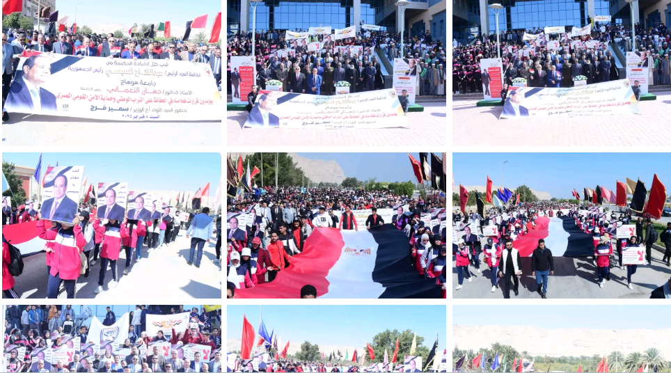 خرج الآلاف من طلاب جامعة سوهاج منذ قليل فى مسيرة حاشدة يقودها الدكتور حسان النعماني رئيس الجامعة، والخبير الإستراتيجي اللواء أ. ح سمير فرج، لدعم وتأييد قرارات الرئيس عبد الفتاح السيسى رئيس الجمهورية، وموقفه الحاسم والقوى فى دعم القضية الفلسطينية والرفض القاطع لتهجير الفلسطينين من أراضيهم، وذلك بمقر الجامعة الجديد، بمشاركة نواب رئيس الجامعة، والقيادات الجامعية، والمستشار العسكري للمحافظة، ومدير التربية العسكرية بالجامعة، وممثلي الأزهر الشريف والكنيسة، وعدد من طلاب المدارس الحكومية والخاصة وطلاب المعاهد الأزهرية، ونخبة من ممثلي المجتمع المدني ومسئولي جمعيات تنمية المجتمع وجمعيات رعاية ذوي الإعاقة على مستوى المحافظة.