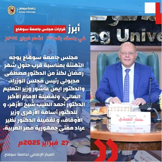 أبرز قرارات مجلس جامعة سوهاج في جلسته رقم ٢١٧ لشهر فبراير ٢٠٢٥ تصفّح المقالات مجلس جامعة سوهاج يستهل جلسته بتقديم التهنئة للرئيس السيسي بمناسبة قرب حلول شهر رمضان المعظمالدكتور حسان النعماني رئيس جامعة سوهاج يترأس الاجتماع الدوري لمجلس الجامعة رقم ٢١٧ لشهر فبراير ٢٠٢٥ اترك تعليقاً إلغاء الردلن يتم نشر عنوان بريدك الإلكتروني. الحقول الإلزامية مشار إليها بـ *التعليق * الاسم * البريد الإلكتروني * الموقع الإلكتروني احفظ اسمي، بريدي الإلكتروني، والموقع الإلكتروني في هذا المتصفح لاستخدامها المرة المقبلة في تعليقي.