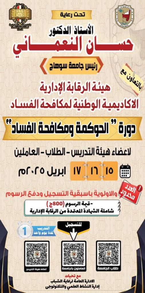 وبالتعاون مع هيئة الرقابة الإدارية و الاكاديمية الوطنية لمكافحة الفساد تنظم جامعة سوهاج دورة “الحوكمه ومكافحة الفساد”، وذلك للطلاب و أعضاء هيئة التدريس و العاملين بالجامعة