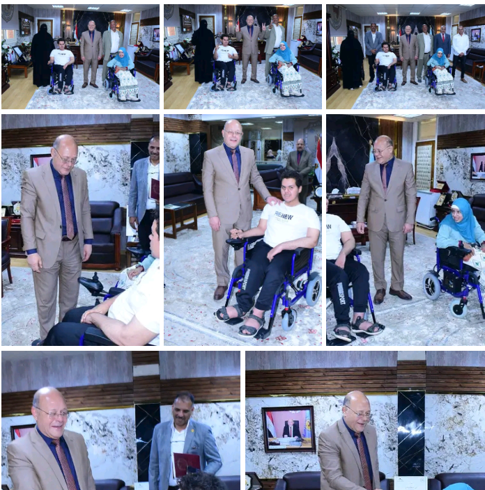 سلم الدكتور حسان النعماني رئيس جامعة سوهاج عدد ٢ كرسي كهربائي متحرك لطلاب من الفرقة الأولى بكليتي التجارة والآداب لمساعدتهما على التنقل بحرية داخل الحرم الجامعي، بحضور الدكتور أحمد عاطف مدير عام الإدارة المركزية لرعاية الشباب ومحمد حمودة مدير إدارة صندوق التكافل الاجتماعي.