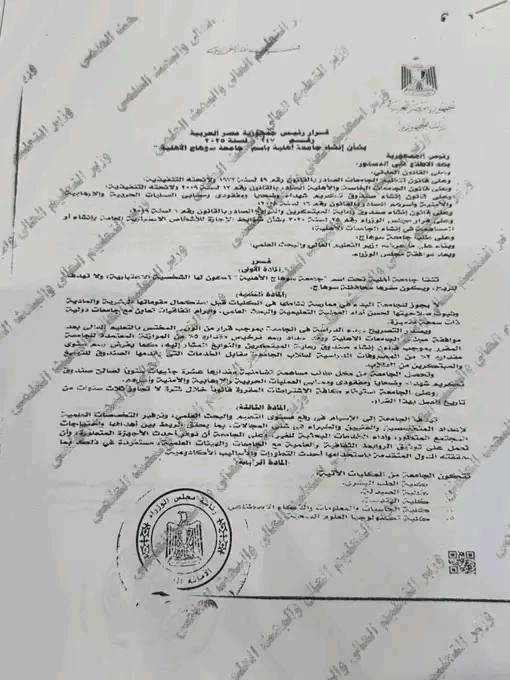 اصدر فخامة الرئيس عبد الفتاح السيسي قرارا جمهوريا رقم 247 لعام 2025 بإنشاء جامعة سوهاج الأهلية، واعتماد ٨ كليات وهم الطب، الصيدله، الهندسه، الحاسبات والمعلومات والذكاء الاصطناعى، تكنولوجيا العلوم الصحيه، العلوم، الإعلام، اللغات والعلوم الانسانية.