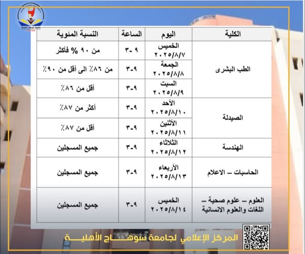 تعلن جامعة سوهاج الأهلية عن استقبال الطلاب لسحب الملف الورقي من مقر الجامعة الاهليه طبقاً للجدول الاتي: تصفّح المقالات رئيس جامعة سوهاج يهنئ مؤسسه الأهرام على مرور ١٥٠ عام من العمل الصحفى الرائدمتابعة امتحان ميد ترم طب اسنان سوهاج 2025-2026 اترك تعليقاً إلغاء الردلن يتم نشر عنوان بريدك الإلكتروني. الحقول الإلزامية مشار إليها بـ *التعليق * الاسم * البريد الإلكتروني * الموقع الإلكتروني احفظ اسمي، بريدي الإلكتروني، والموقع الإلكتروني في هذا المتصفح لاستخدامها المرة المقبلة في تعليقي.