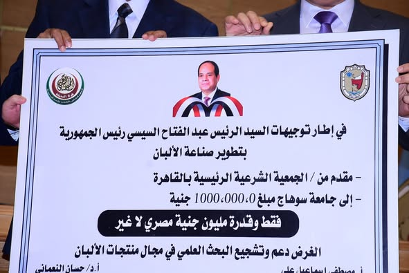 أعلن الدكتور حسان النعماني رئيس جامعة سوهاج انه فى إطار التعاون المثمر بين الجامعة و الجمعية الشرعية الرئيسية أحدى الجمعيات التي تقوم بالعمل الخيري في مصر والعالم الإسلامي، فقد قامت الجمعية بمنح مبلغ مليون جنيه لدعم المشروعات البحثيه المقدمة من أعضاء هيئه التدريس في مجال صناعة الألبان في مصر،