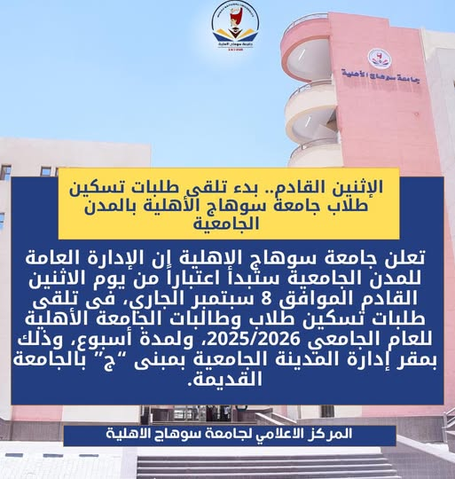 أعلن الدكتور حسان النعماني رئيس جامعة سوهاج الأهلية أن الإدارة العامة للمدن الجامعية ستبدأ اعتباراً من يوم الاثنين القادم الموافق 8 سبتمبر الجاري، فى تلقى طلبات تسكين طلاب وطالبات الجامعة الأهلية للعام الجامعي 2025/2026، ولمدة أسبوع، وذلك بمقر إدارة المدينة الجامعية بمبنى “ج” بالجامعة القديمة.
