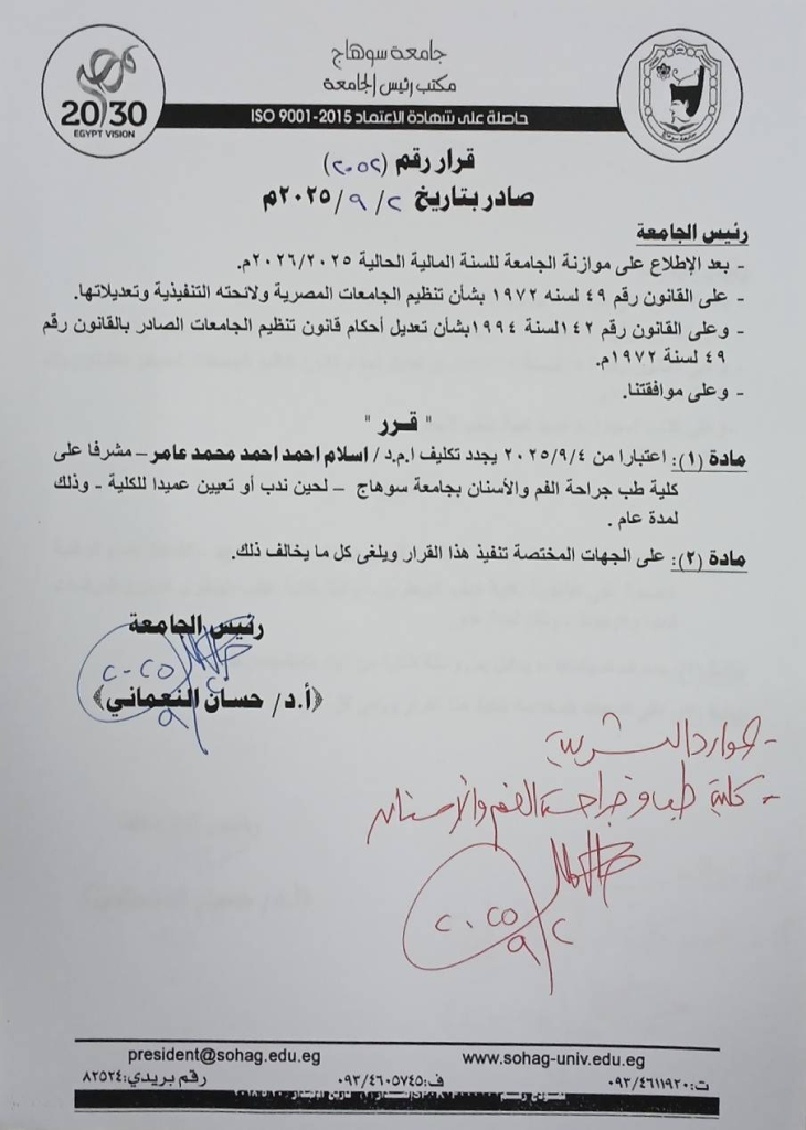تتقدم اسرة كلية طب وجراحة الفم والأسنان وقيادتها سيادة وكيل الكلية لشئون التعليم والطلاب- سيادة وكيل الكلية لشئون البيئة والمجتمع بالتهنئه القلبية لمعالى الاستاذ الدكتور / اسلام محمد عامر لتجديد الثقة سنة عميد كلية طب وجراحة الفم والأسنان متمنين لسيادته كل التوفيق والسداد